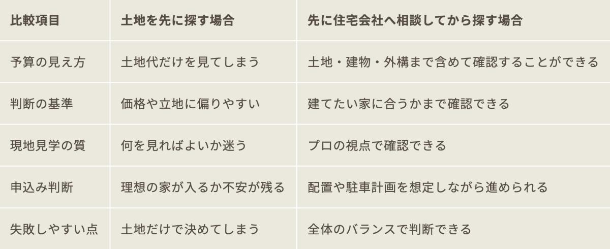 土地探しを始める前は、「まず不動産サイトを見る」だけになってしまうことがあります。ですが、家づくりまで含めて考えるなら、先に住宅会社へ相談してから探した方が流れは整いやすくなります。