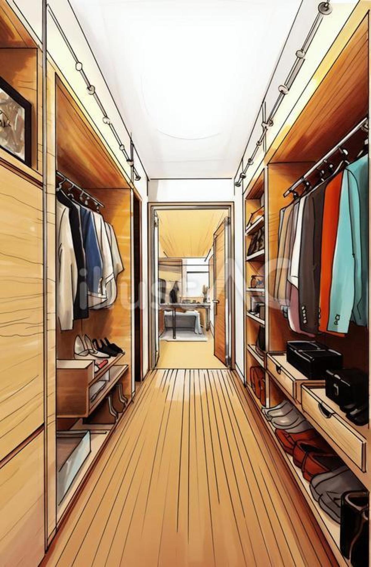 ウォークスルーは、入り口が2つあるウォークインクローゼットのことです。壁の両側に棚やハンガーパイプが取り付けられています。動線が確保しやすいだけでなく、換気もしやすくなるので湿気が篭りにくくなります。