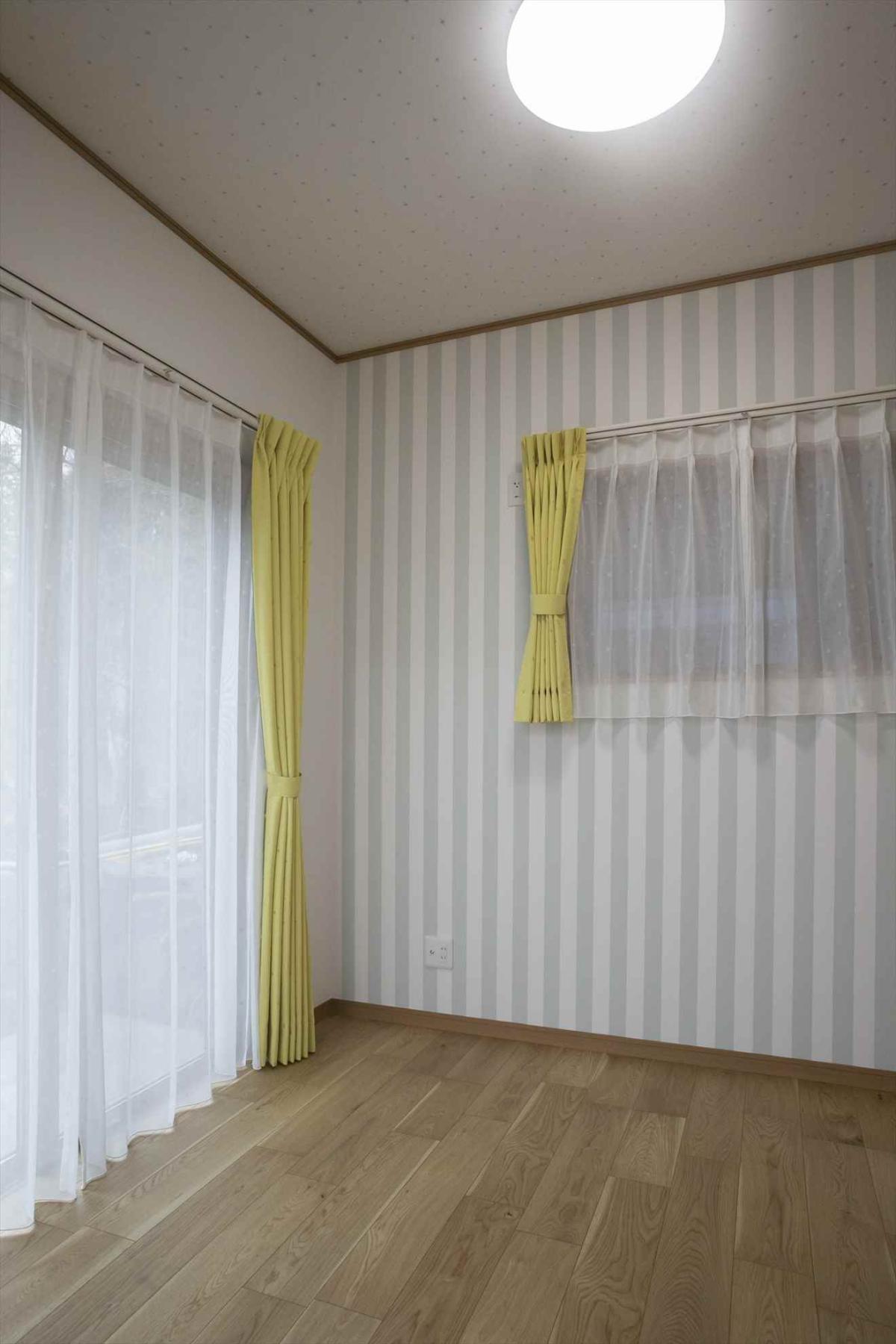 洋室:ストライプの壁紙に黄色いカーテンが素敵ですね