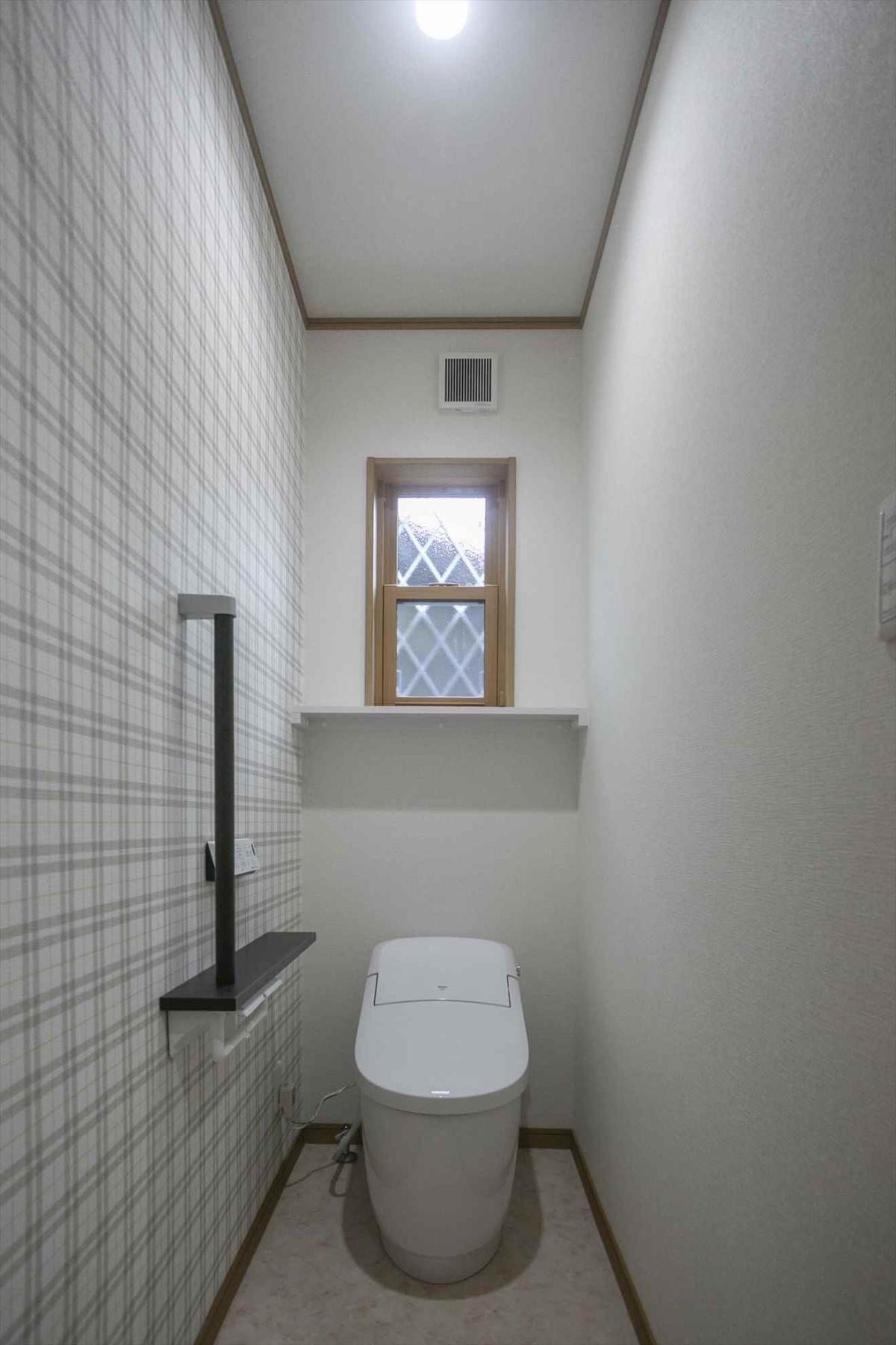 トイレ:チェックの壁紙を1面だけ使ってアクセントにしています
