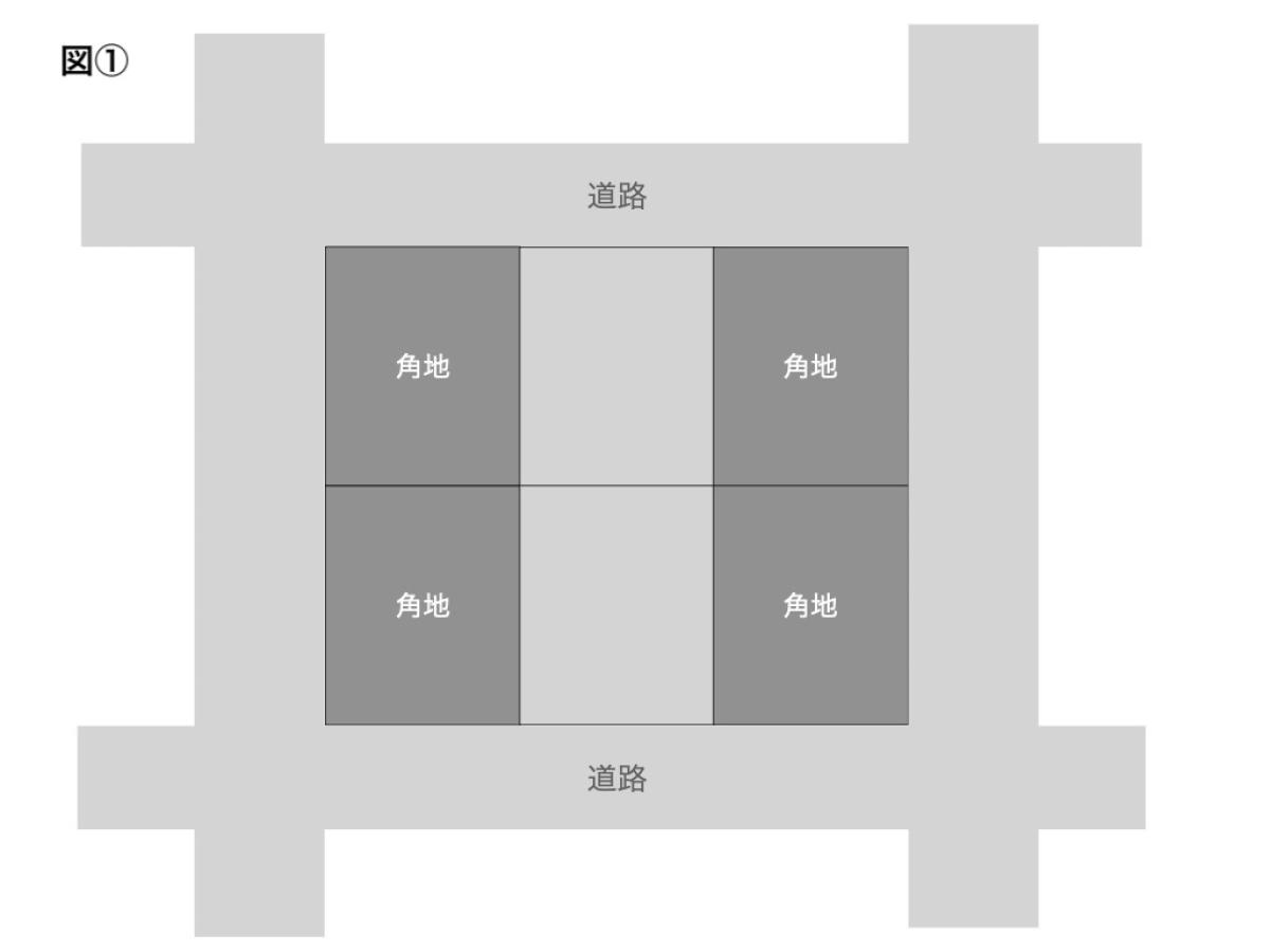 角地とは、図1のように2つ以上の道路に接道している土地のことです。先ほど「角地は最も人気のある土地」とお伝えしましたが、分譲地の販売でも、多くの場合、一番最初に売れてしまう土地は「角地」です。しかし、良い家づくりをするためには土地購入の際にしっかりとメリットとデメリットを知っておく必要があります。
