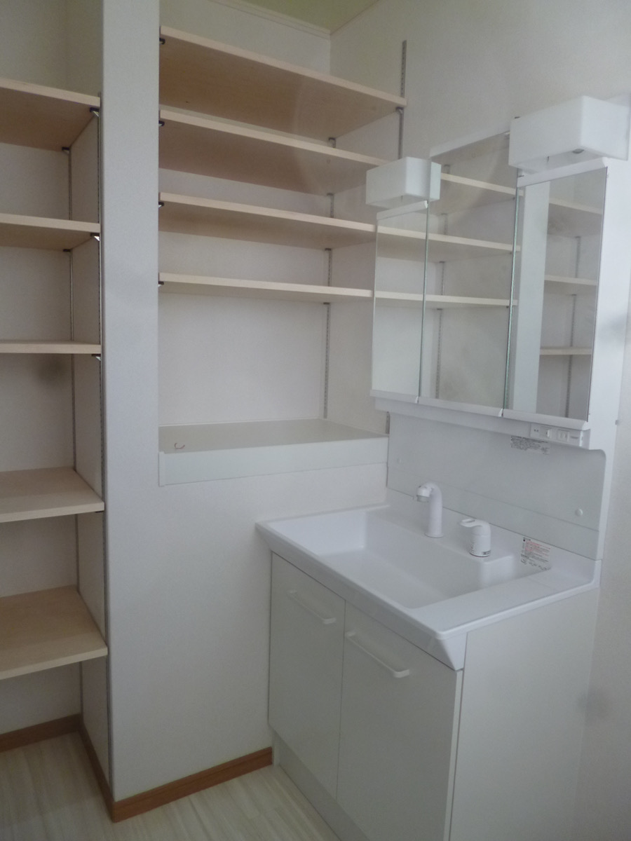 リビング・ダイニングのように広いスペースの場所以外では、収納を後からつけることは困難な場合が多いのです。例えば洗面脱衣室では、タオル類を収納する場所、タオルや洗面用具、着替えを一時的に置いておく棚が必要になります。洗面脱衣室をリビングのように広く設計することはありませんので、後から半帖〜1帖程度の収納や棚、カウンターを設置するスペースの確保は簡単なことではありません。